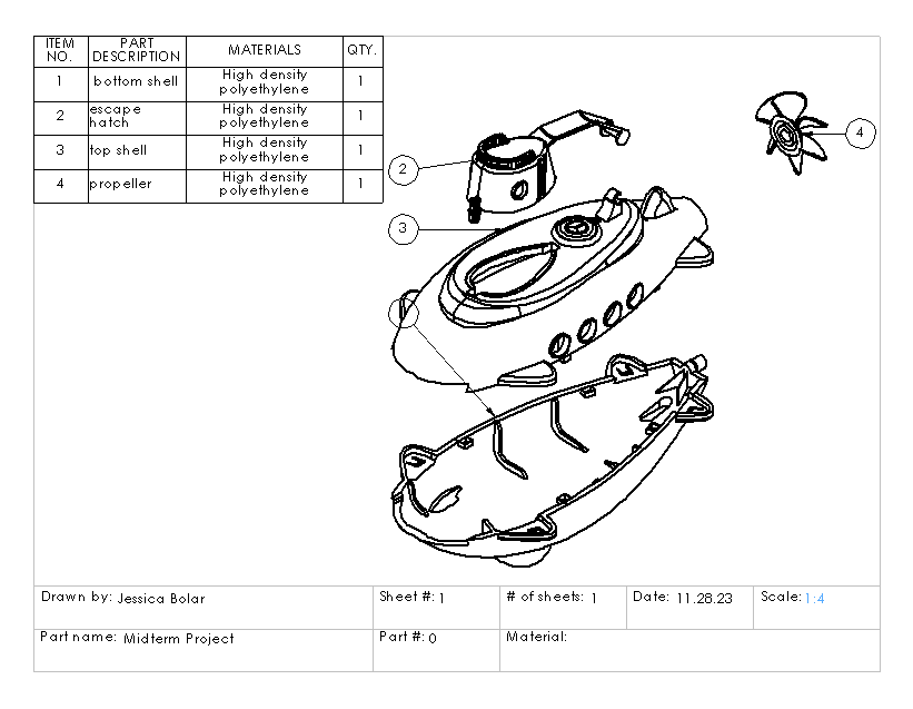 Project Overview: A toy submarine was modeled as part of Columbia University's MECE 3408 Computer Graphics & Design course, which is designed to familiarize students with CAD software and develop their understanding of technical drawings as a means of communicating technical ideas in mechanical engineering design and products. The Fall 2023 midterm project focused on reverse-engineering a toy, accurately modeling its components in SOLIDWORKS, and assembling them to digitally recreate the device.